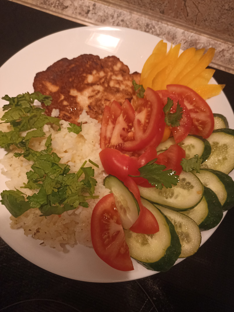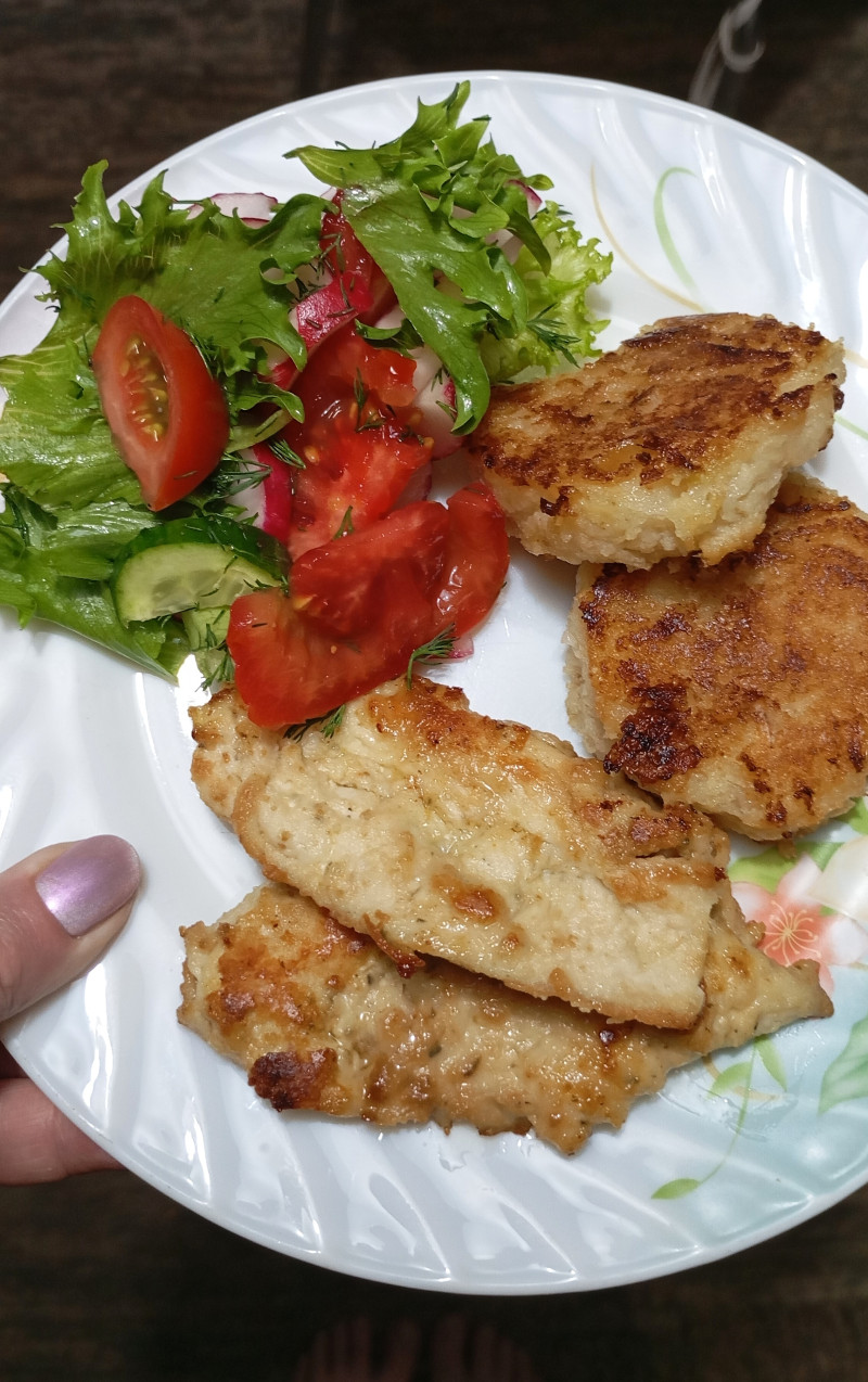 Ужин, капустные котлеты, вполне себе норм, не пойму, что там связующее, а упаковку выкинули и я не посмотрела, но капуста не забита манкой или мукой. Покупала в магазине Да, но даже не помню кто производитель. 😁🤦‍♀️ Куриная грудка и овощи.