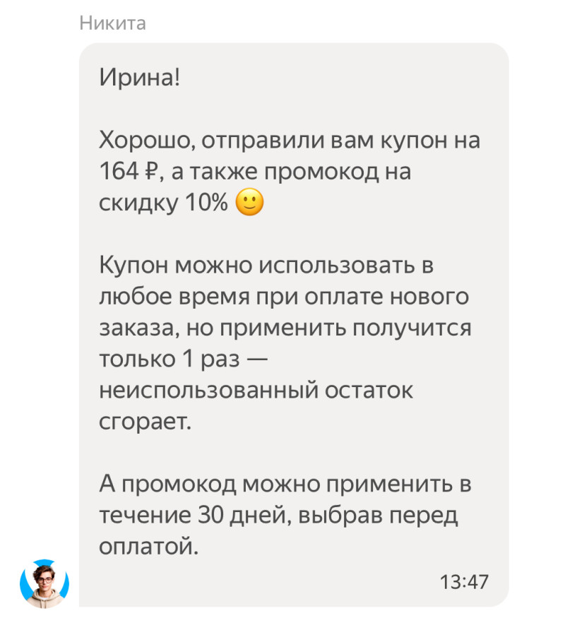 ЯндексЛавка извинились за порванную овсянку, вернули деньги за нее и дали промокод на 10%! Молодцы ребята!