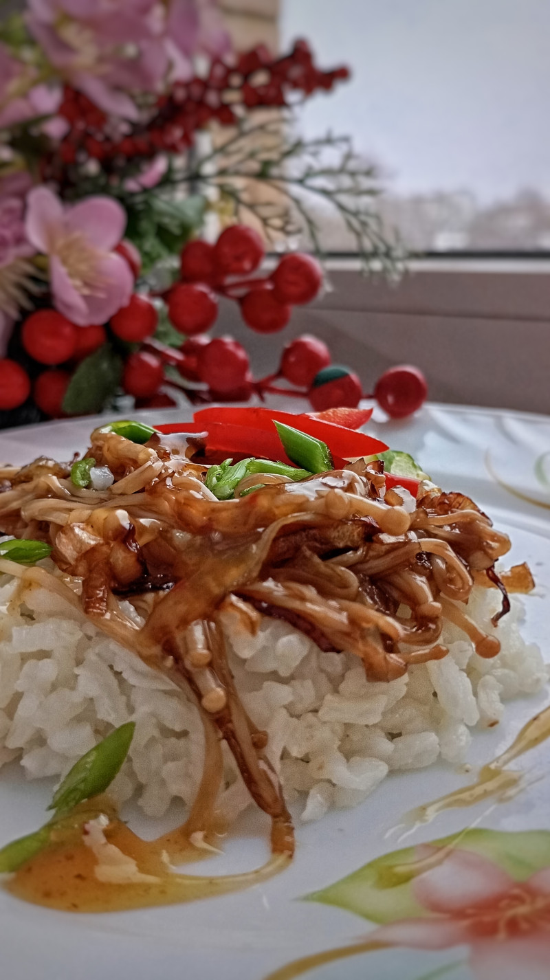 Ужин: рис, грибы эноки и болгарский перец с огурцом, приправила чуть соусом манго-чили.