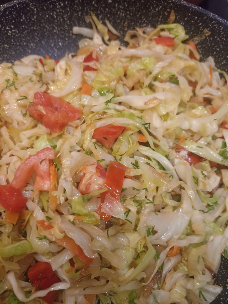 Прижарила молодую капусту с перцем, помидором, зеленью