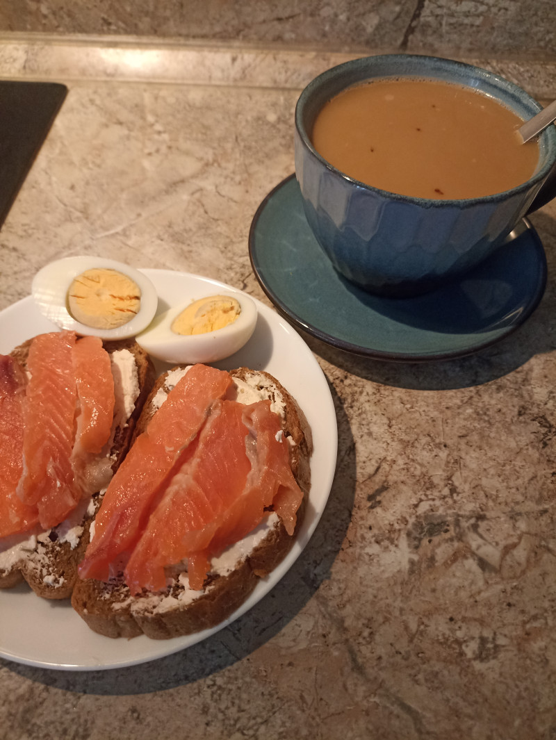 Всем доброго и бодрого. Дома утром кофе с молоком и сыр разделённый с собакиным.