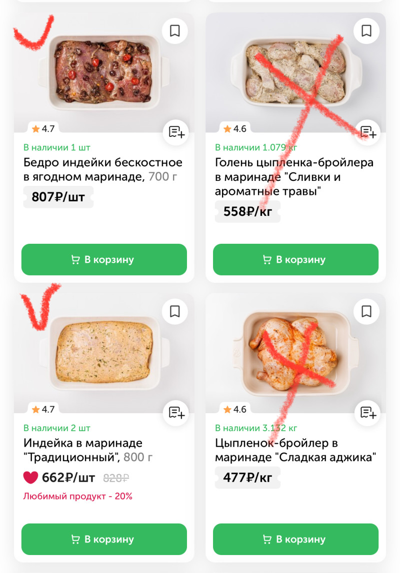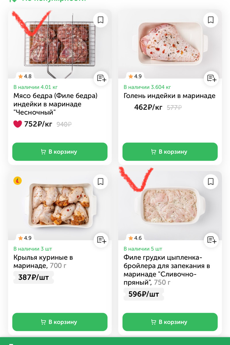 Мяско в маринадах, смотрим чтоб без кожи и минимум жиров