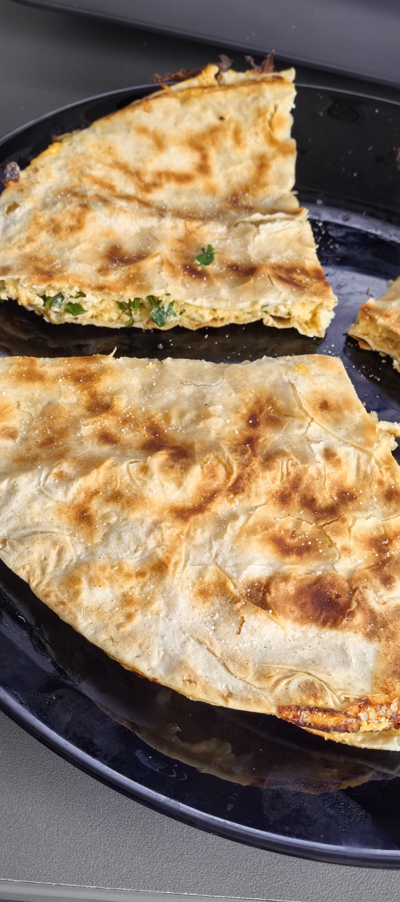 На завтрак смешал, творог с яйцами, зеленью и сыром, выложил на лист лаваша, вторым листом лаваша накрыл, обжарил с двух сторон.