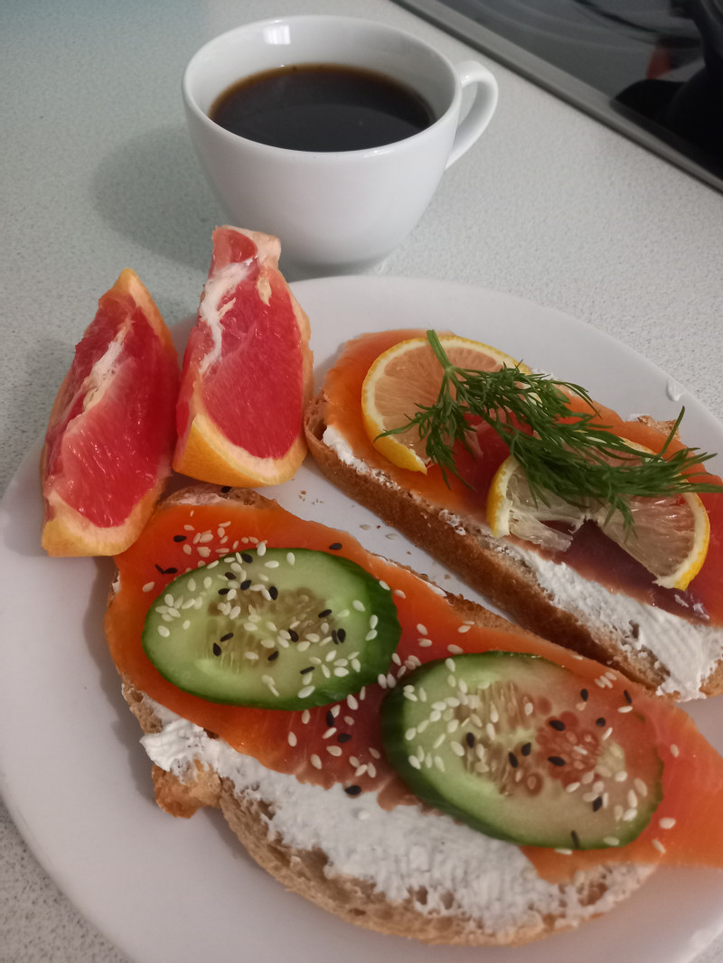 позавтракаю..купила вчера в ночи лосось слабосоленый... и сыр творожный есть.. сверху огурчик положу и кунжутом присыплю