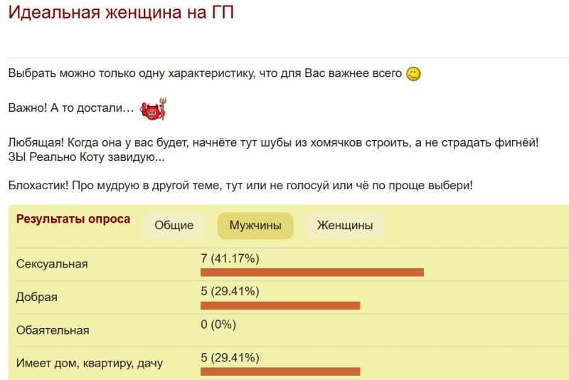 Беда немного в другом. Мужики (как это не парадоксально) на этом форуме, более честны в своих желаниях.