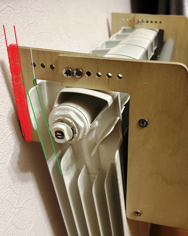 Какая же там десятка толщина 5..6 хорошо если. Вот ширина где отверстия там да ~30. т.к. большая гайка на 25 У меня вон рядом аналогичная батарея, между рёбрами радиатора 24 мм, плюс вверху загиб на 2., т.к. зацеп нужно максимум 20 мм если из фанеры, дабы плотно зашёл в радиатор, а ещё там отверстие на серой линии будет ослаблять как точка напряжения.