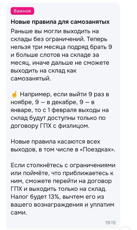 Ален, забыл тебе про подводные камни написать, а их там не мало, если работаешь самозанятым то налог 6% платишь в казну, но с этого года из-за поднятия нашими слугами народа ставки НДС до 22% озон тоже решил сделать так что не больше 9смен можно в месяц работать если больше 9 тогда тебя блочат и ты можешь работать только как ГПХ а это уже придётся платить 13% от заработанной суммы, На самих складах много чурбанов они там даже старшими смены работают соответственно своих таких же ставят там где м