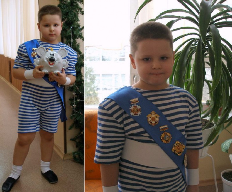 В детском саду у моего ребёнка был новогодний праздник и нам сказали , что наши мальчики должны быть в костюмах атлетического борца . Я себе представил в виде образа , нашего легендарного борца начала ХХ века и по его примеру мы с женой шили в ателье костюм. Купили большую "тельняшку" и отдали её в ателье , что бы по размеру ребёнка сшили нам типа комбинезона с молнией на спине.
