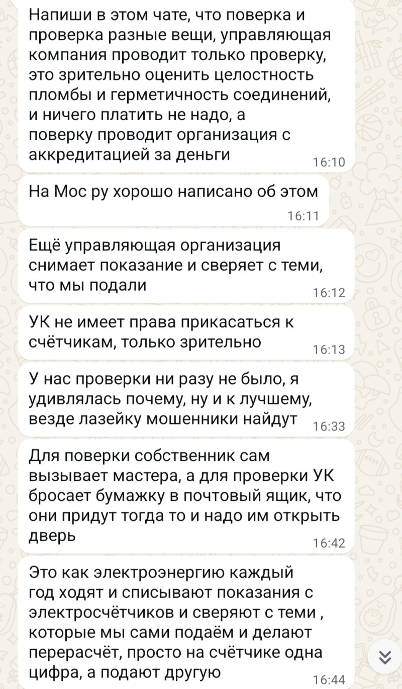 Добрый день ! Прошу консультации по поверке водяных счётчиков . Сегодня приходил техник для поверки счётчика ( меня на месте не было ) . Такого откровенного бреда от управляющей компании ( ГБУ Жилищник ) ещё свет не видел : " Нам для сверки показаний надо прикрутить к смесителю прибор .... " " Прикрутить ... , подсоединить шланг ... к смесителю " ??!! Проверочные ( мерные ) " тазики они уже не носят , типа 21 век на дворе ... Мало того , сказал . чт