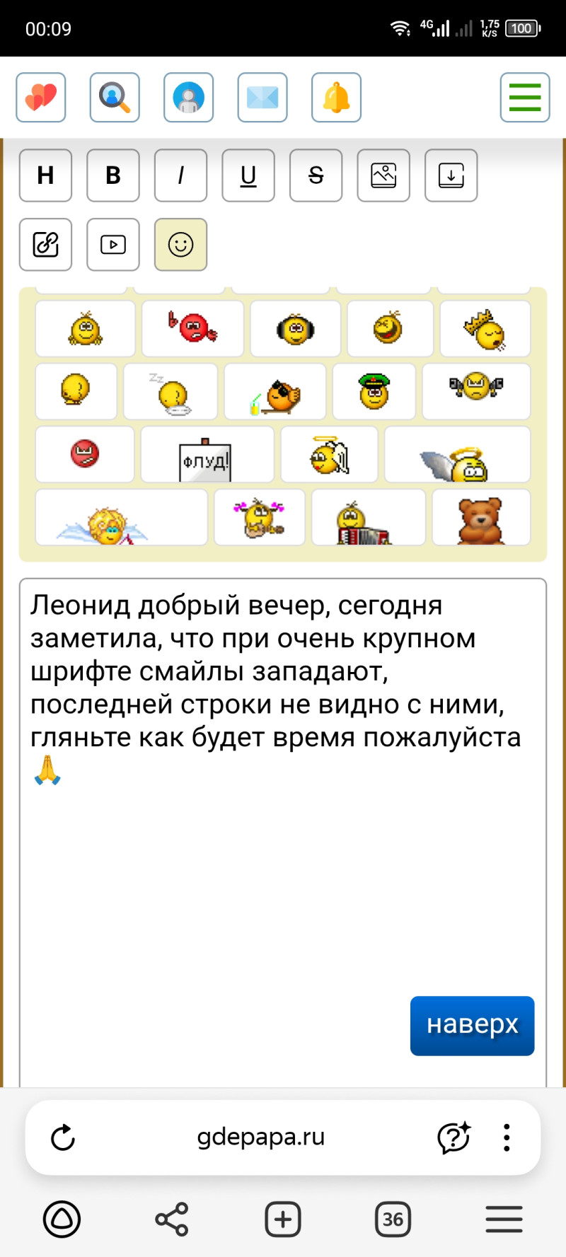 Леонид добрый вечер, сегодня заметила, что при очень крупном шрифте смайлы западают, последней строки с ними не видно, гляньте как будет время пожалуйста 🙏