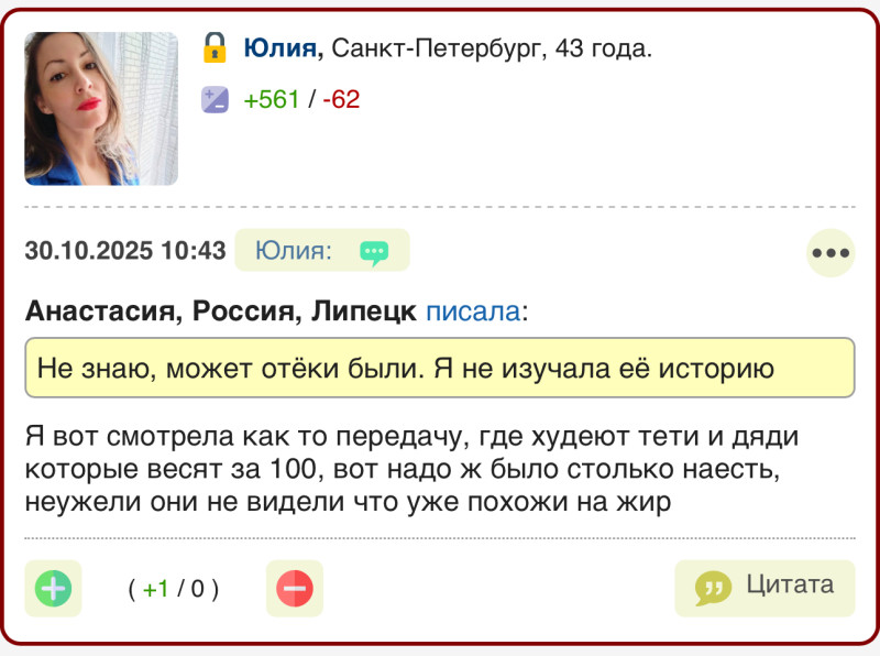 Леонид, добрый вечер. Возвращаясь к вашему вопросу о необоснованных жалобах и переходе на личности - в теме ЗОЖ мужчина позволяет откровенные оскорбления в адрес женщины старше его. Это же неприемлемо в цивилизованном обществе. Со стороны женщины оскорблений не было. Мужчина хам.