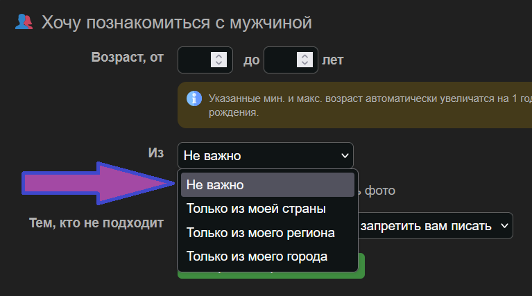 Было бы хорошо, если бы вот здесь тоже выбор конкретной страны был, а не только "Из моей страны". Я имею ввиду, вместо "Не важно" - выбор страны, откуда могут написать.