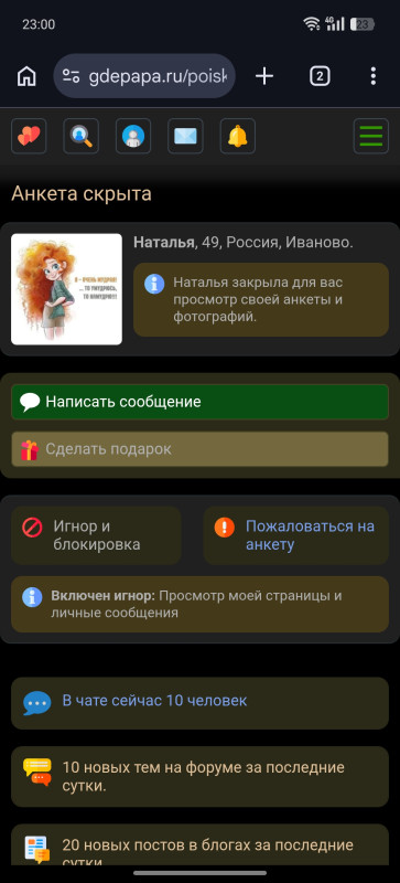Я вроде и не заходила в анкету, чтоб спецом блочить персонально.